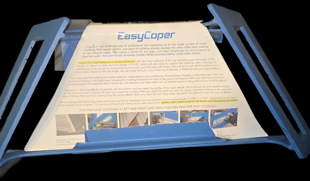 The EasyCoper Crown Molding Coping Tool is a jig and template set designed specifically for cutting crown molding. With the brand EasyCoper, this set includes two items that make it easy to create perfect crown molding pieces. The tool is suitable for professionals and DIY enthusiasts alike, providing accurate and efficient results for your home improvement projects.