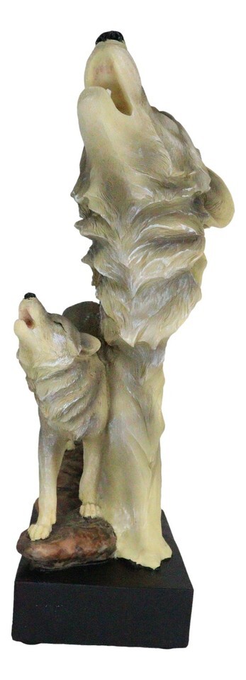 ? This Wolf Spirit figurine is an amazing inspirational and spiritual gift for a loved one or a striking decor piece for any room. Each figurine showcases the wolf's majestic bearing, brindled fur and noble expressions. An alpha wolf bust is howling at the moment as the focal point on the sculpture with a full bodied wolf beneath the bust descending from a rocky slope. The sculpture is topped off with a black pedestal base to give it a beautiful museum gallery look.