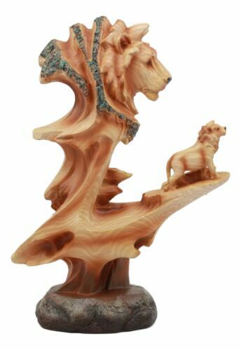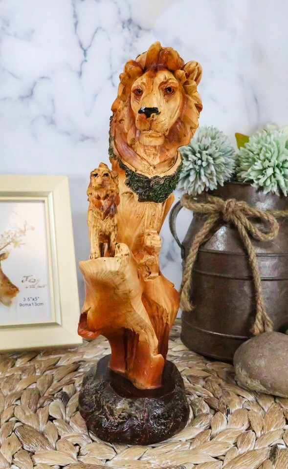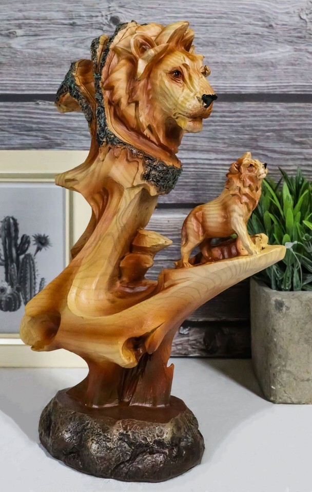 ? This Safari Pride Rock Scenic Lion Bust Family Sculpture is made of designer composite resin, hand painted and polished in faux wood finish. The faux wood finish adds a special touch of nature to the sculpture. Color Tone may vary.