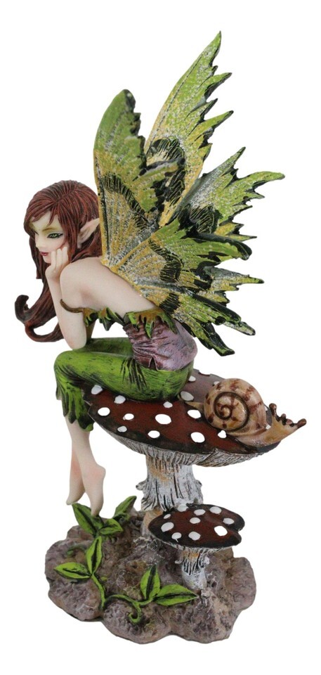 ? This sculpture features a fairy sitting on a mushroom and pondering life. The pixie wears an outfit of leafy green, with a tan sash around her waist. She has rich, auburn hair, and rests her chin upon her hands. She shares her toadstool with a snail, and another, smaller mushroom grows nearby. Delightful and whimsical, this collectible is sure to be a hit with any faery lover!