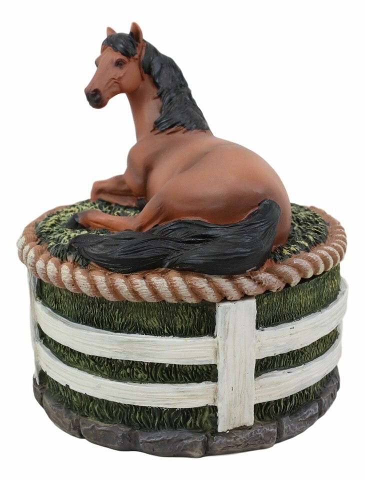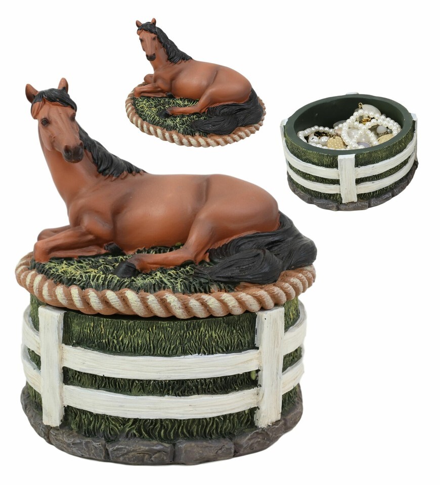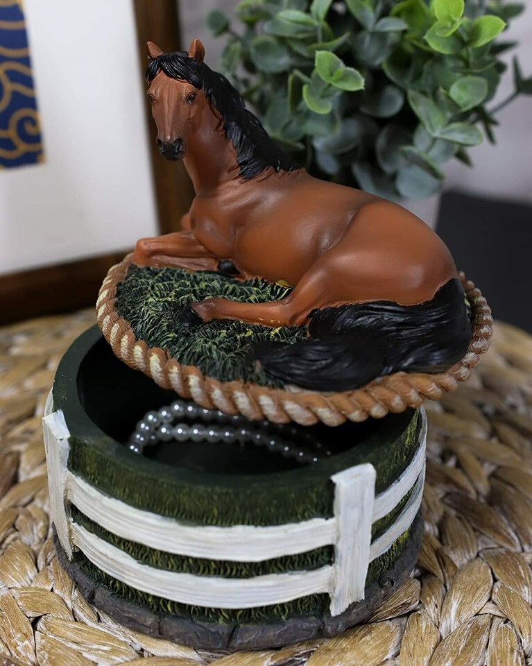 ? For the horse lovers and fans of country western laid back lifestyle, we present to you this hand sculpted sculptural resin decorative box. We feature a resting brown chestnut horse atop the green ranch pasture, braided farm ropes and white country fences sculptural storage base. It is an all in one rustic decor accent and functional knick knack storage organizer!