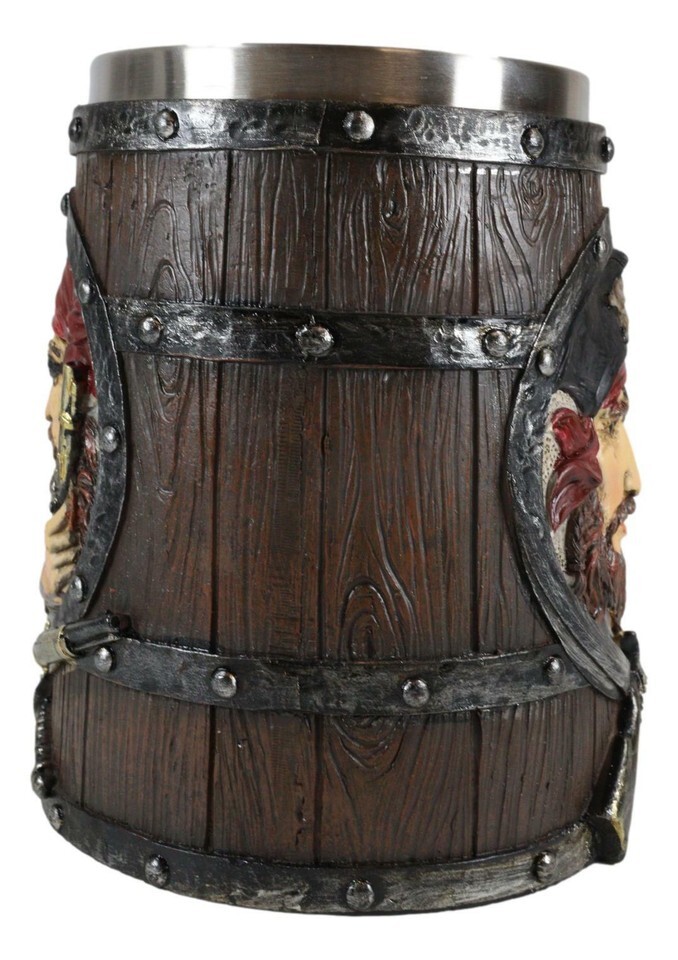 ? This sea worthy drinking tankard features a relief image of 2 rivalling pirates flanked by a cutlass and pistols. Made of cold cast resin, it`s designed to look like a barrel (pirates are well known as rum drinkers!), with metallic silver accents encircling the rim and bottom with tribal designs on the side. The stainless steel liner keeps your drink cool or hot, and holds 14 ounces of your favorite beverage.