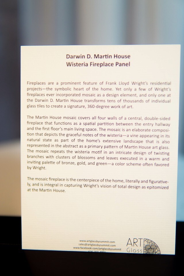 ? Fireplaces are a prominent feature of Frank Lloyd Wright's residential projects-the symbolic heart of the home. Yet only a few of Wright's fireplaces ever incorporated mosaic as a design element, and only one at the Darwin D. Martin House transforms tens of thousands of individual glass tiles to create a signature, 360-degree work of art. For the Darwin D. Martin House in Buffalo, New York (1904), Wright designed a magnificent mosaic fireplace. Destroyed over time by the elements and thieves, it was meticulously re-created as part of a $50 million restoration.