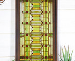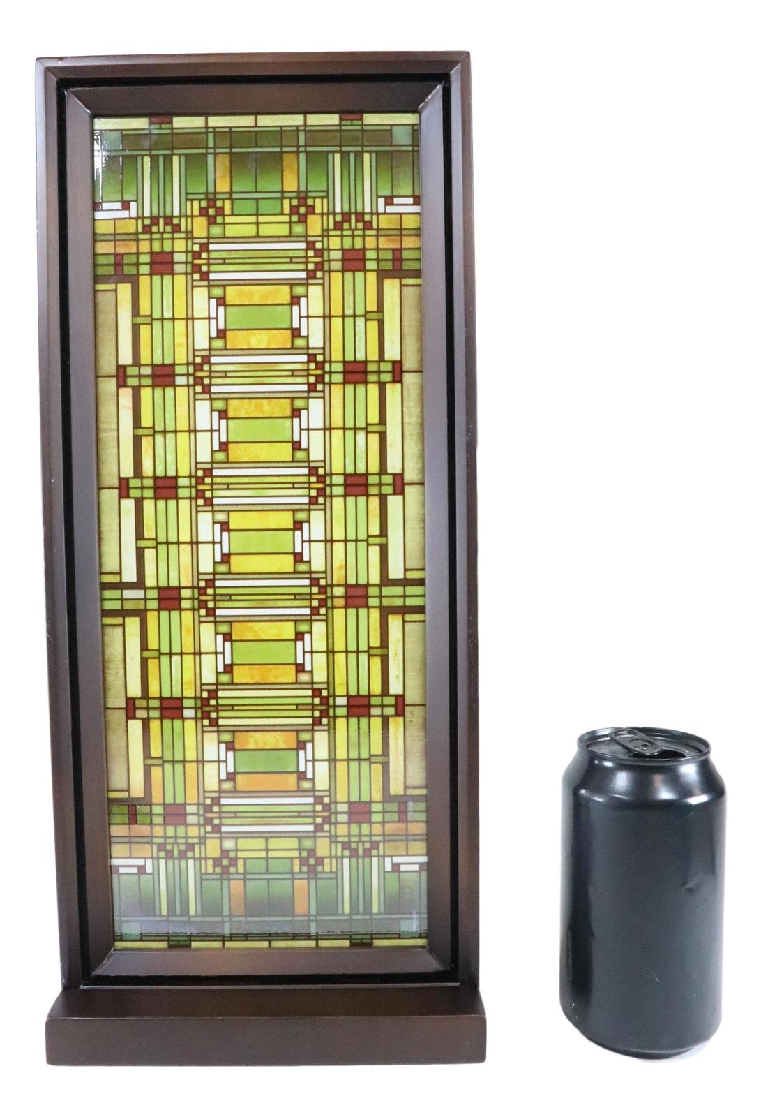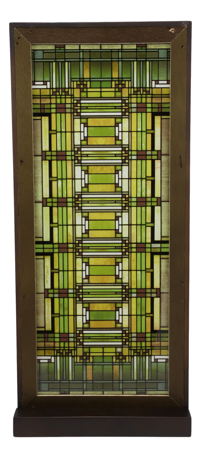 ? Adapted from the complex rectilinear design of the art glass skylights in the impressive entrance of Frank Lloyd Wright's Studio (Oak Park, IL, 1898). Painted with transparent enamels, kiln-fired framed in wood. Wood stand included and hardware for hanging included (refer to photos).