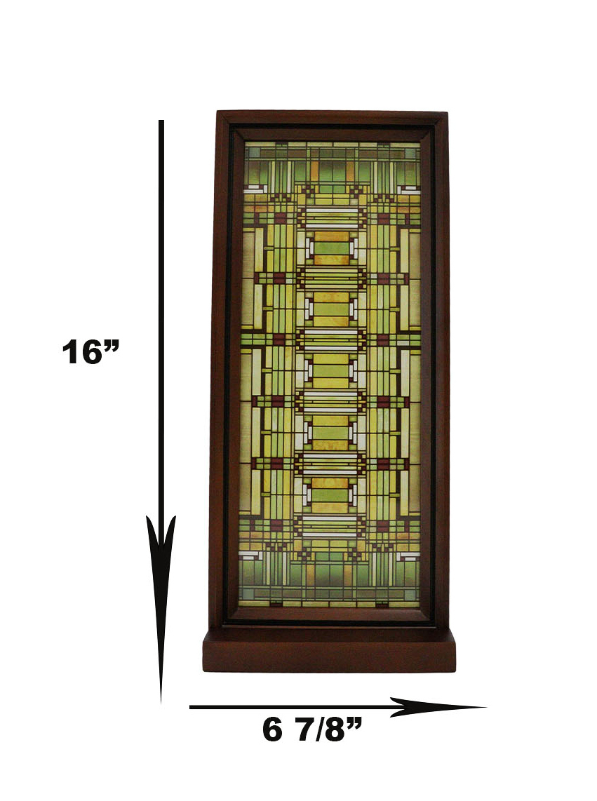 ? The measurements of this beautiful Frank Lloyd Wright Glass art are: GLASS: 15.5" Tall x 7" Wide x 0.25" Thick. Wooden Base Stand: L: 7" x W: 3" x H: 1"