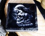 ? The front of each coaster portrays a raven sitting on a skull in reference to Poes famous poem. The skull rests on top of a stack of books. In the background, a full moon shines in the background. Around the edges, there is a border with a wood-like grain.