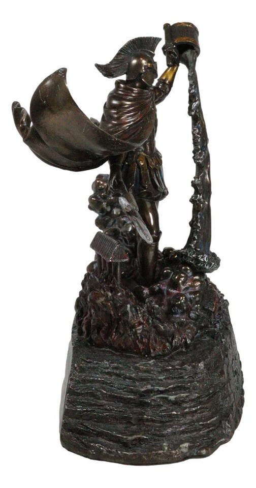 ? This beautiful sculpture depicts a heroic Saint Florian wielding a spear on one hand and a bucket of water on the other. Large amounts of water is poured out of the bucket, into the raging fire underneath him. The sculpture is set on a rocky base with his name engraved on it.