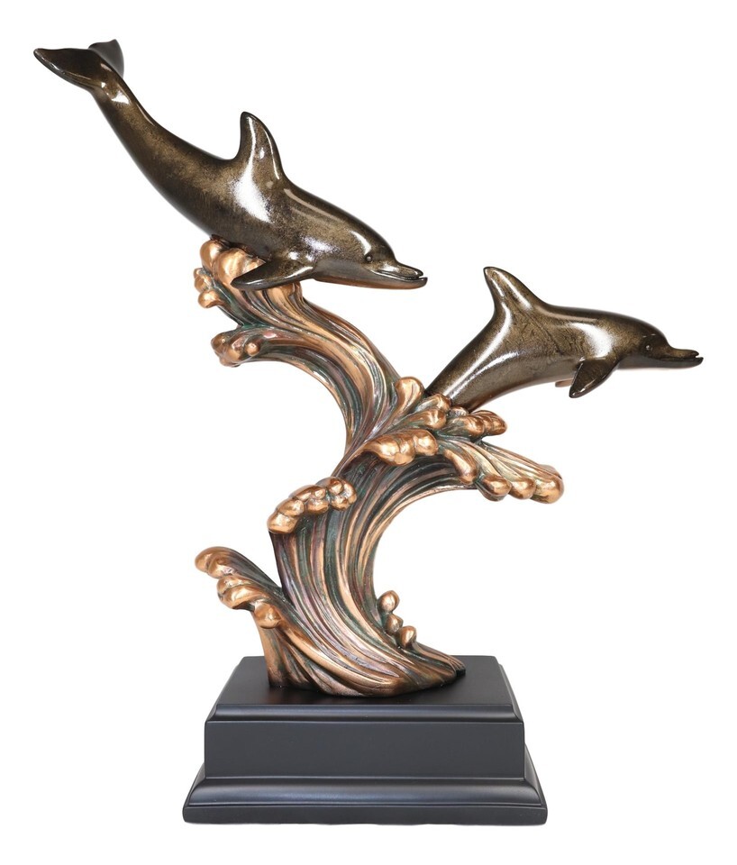 ? Hear the call of the ocean with this breathtaking sculpture featuring 2 bottlenose dolphins surfing with the boisterous waves. Our impressive, 360-degree, bronze electroplated resin statue is expertly finished with a hand-applied, classic sepia bronze patina and polish to bring out the amazing detail.