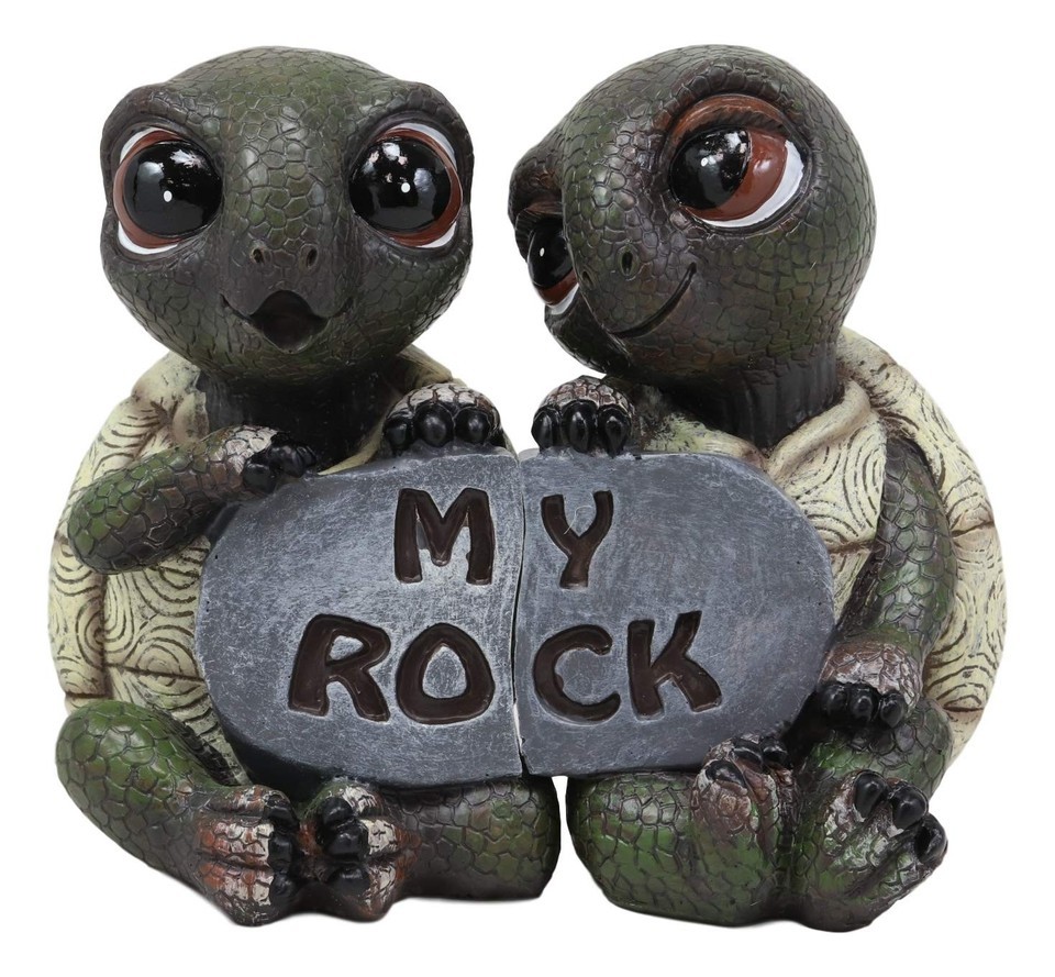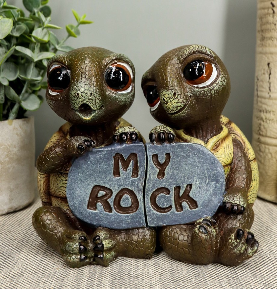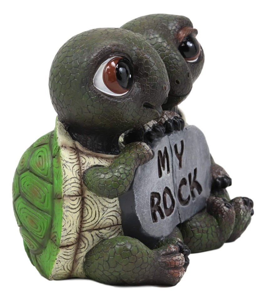 ? Through the test of time, a loving husband and wife tortoise couple understands that marriage requires rock solid commitment. The adoring wife looks at her man with love, although he looks slightly startled. Together they hold one half of the sign that reads 'My Rock', ironically on two pieces rocks.