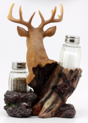 ? This 12 Point Buck Salt Pepper Shakers Holder figurine is made of cold cast resin, hand painted and polished. Color tone may vary.