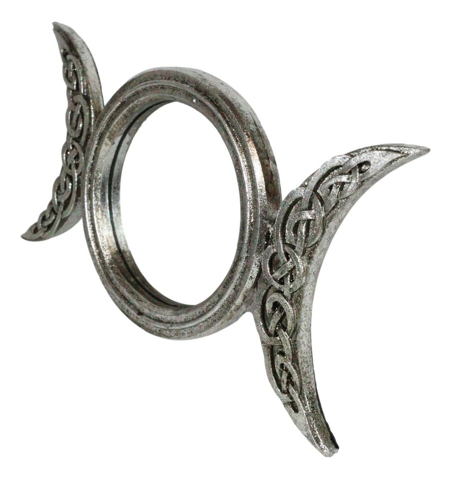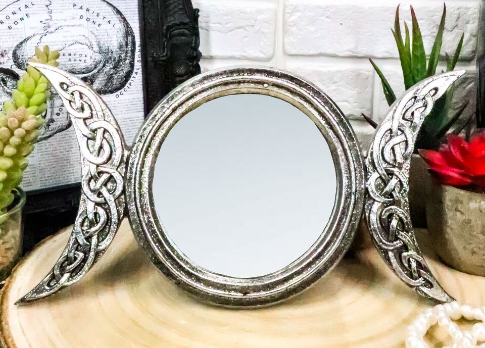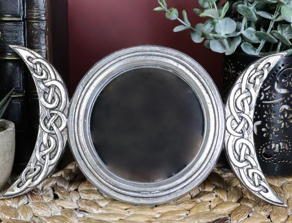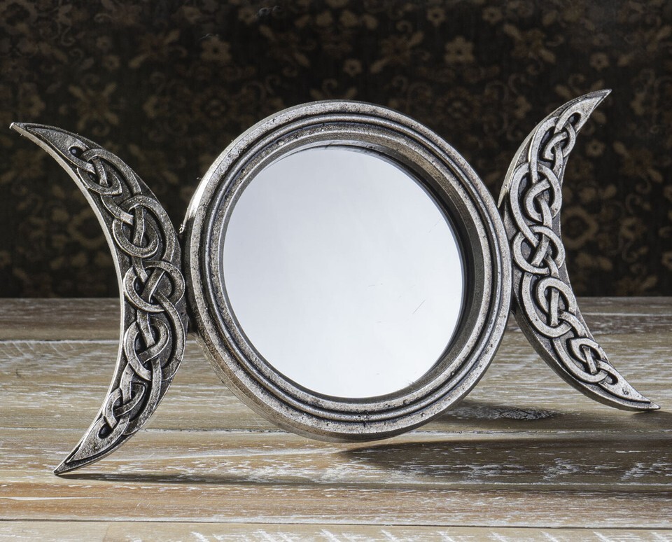 ? Goddess Arianrhod's ancient symbol of the waxing, full and waning moon. The goddess as maiden, mother and crone in a cosmic cycle of life and death, reincarnation and rebirth. This unique Celtic triple moon mirror, can be free standing or wall hung.