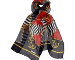 Vintage Echo brand sheer chiffon scarf featuring a bold nautical theme with anchors, ship wheels, ropes, and chain accents. The vibrant mix of red, black, yellow, and white stripes makes this piece a standout accessory for any outfit. Lightweight and semi-sheer with rolled edges.