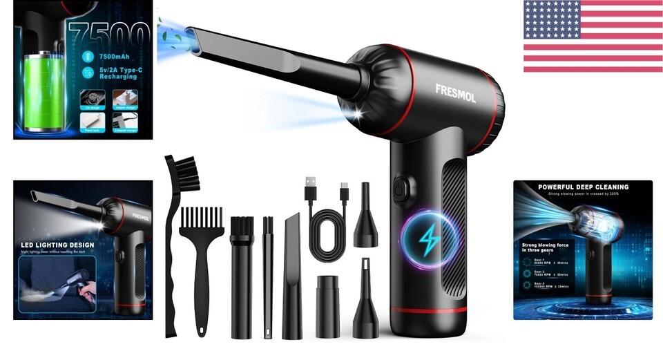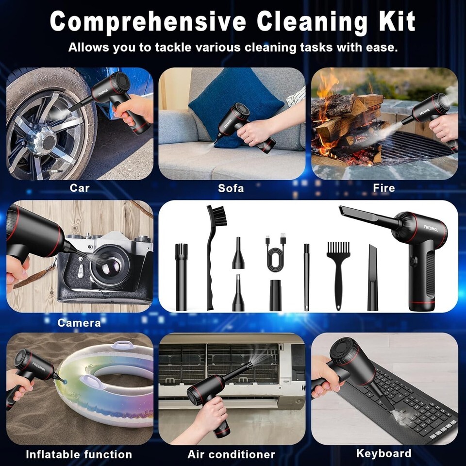 Are you tired of using disposable canned air for cleaning? Upgrade your cleaning routine with our Eco-Conscious Compressed Air Duster! Engineered with a powerful 100,000 RPM motor and customizable airflow settings, this versatile tool ensures that no dust or debris will escape your reach. Enjoy the convenience of a rechargeable battery that lasts up to 40 minutes, complemented by a comprehensive cleaning kit tailored to tackle any mess you encounter.