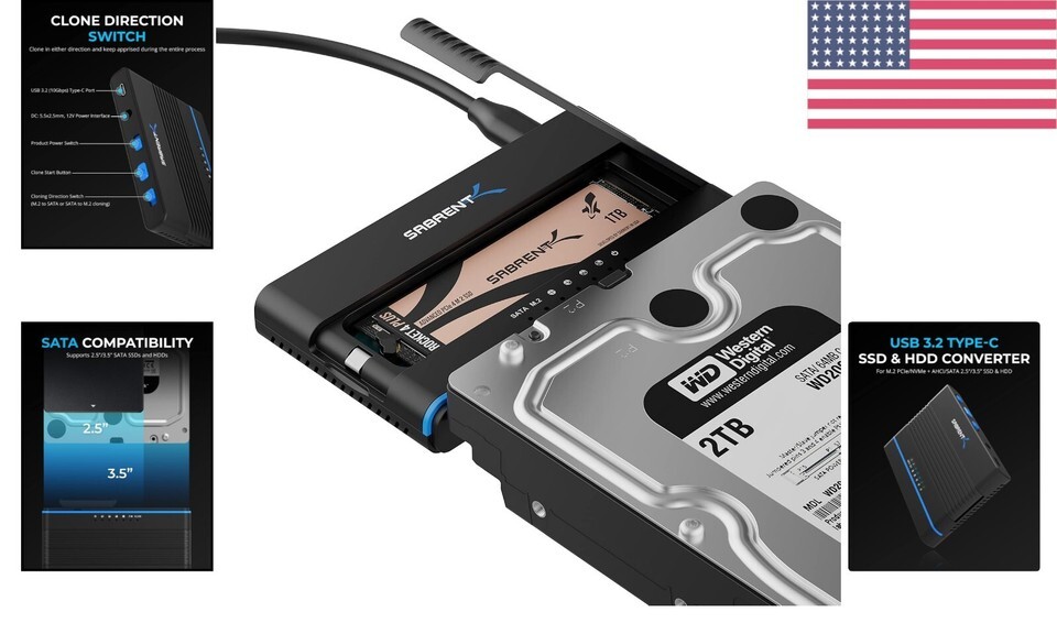 - Efficient USB 3.2 NVMe M.2 & 2.5/3.5 Inch SSD/HDD Converter with Offline Cloning
