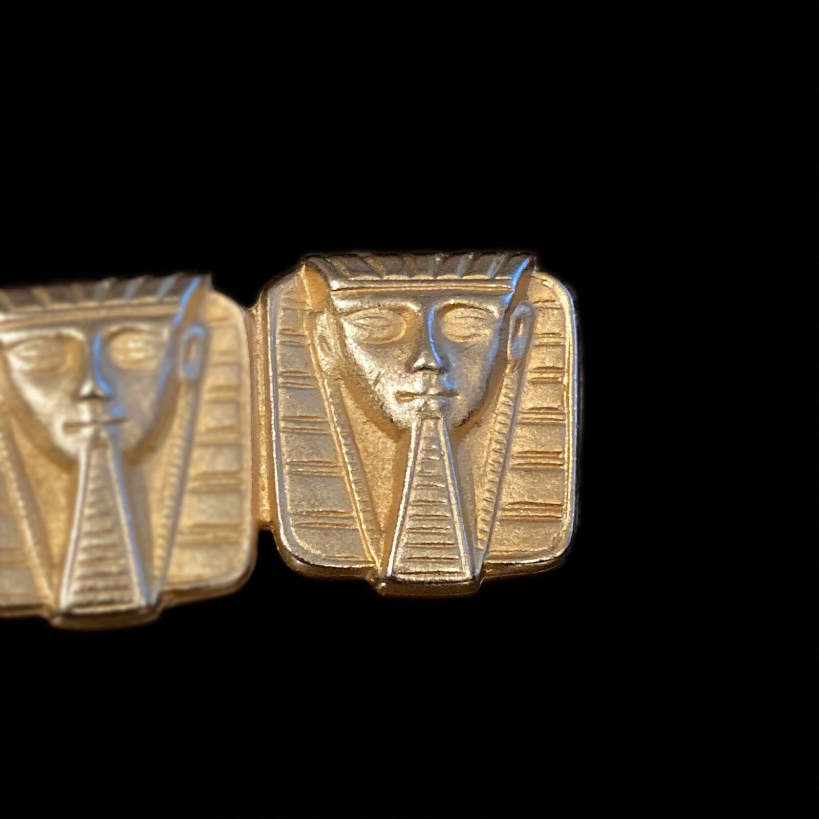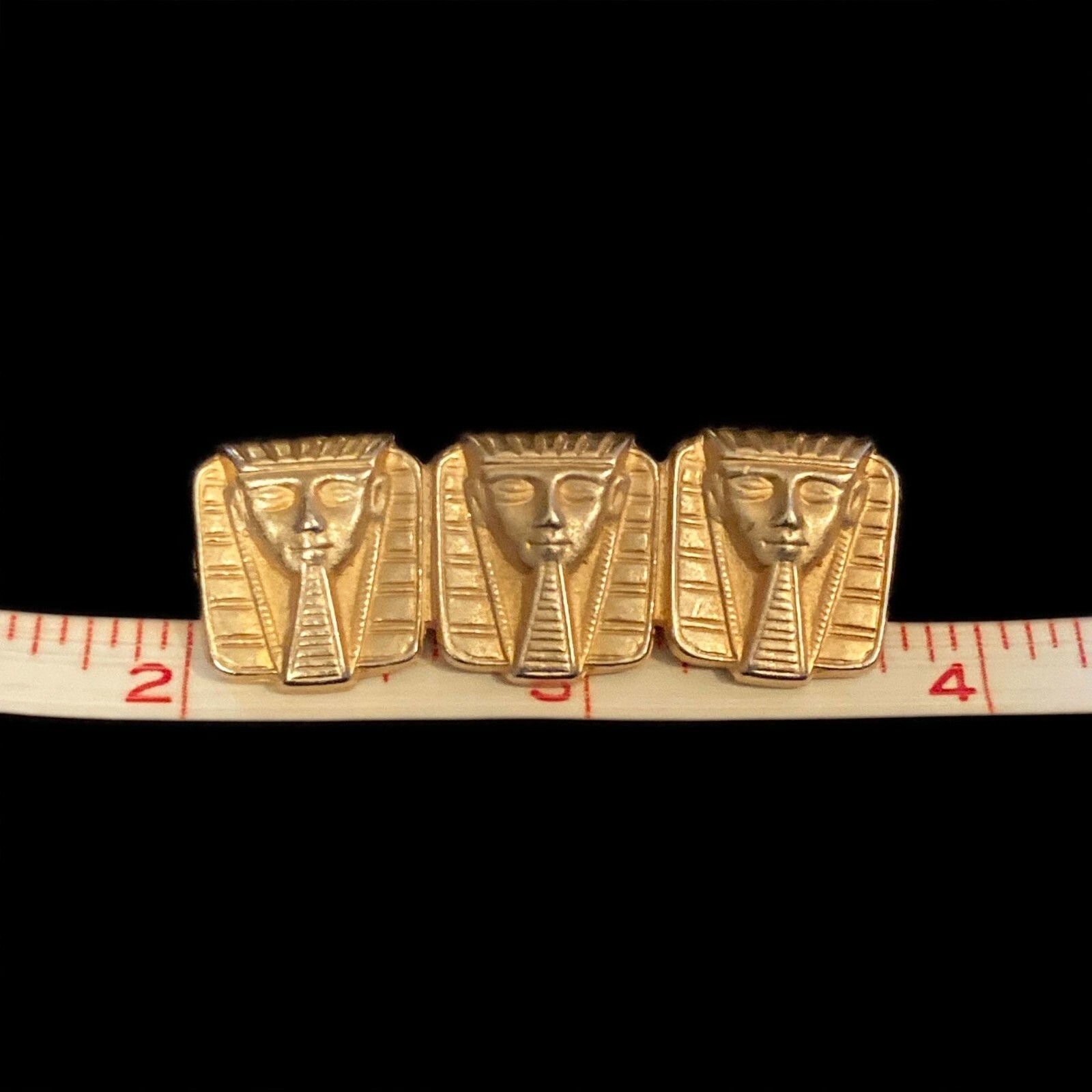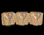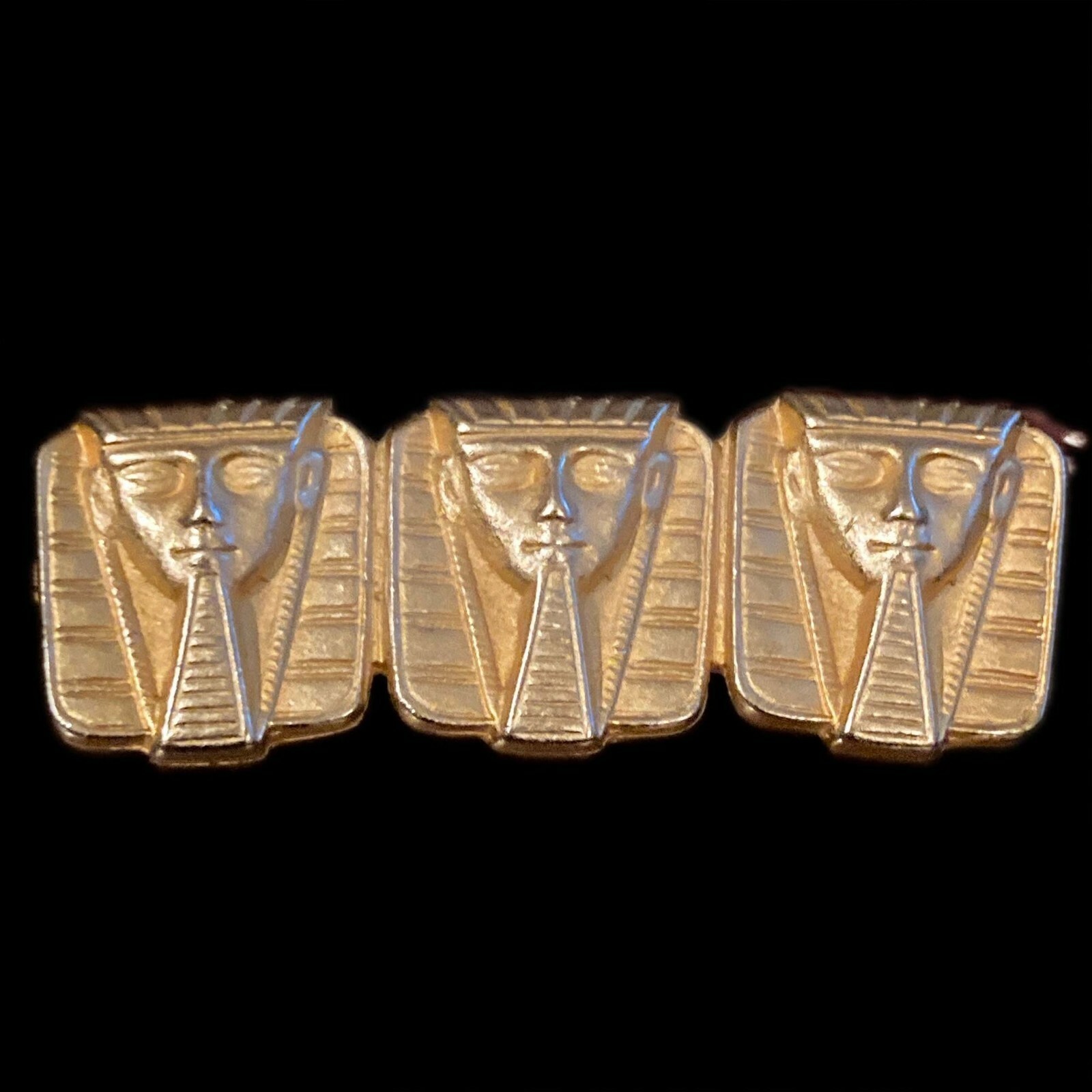 Vintage Egyptian revival pharaoh brooch in gold-tone metal. The brooch is made up of three plaques with the face of a pharaoh on each. The pharaohs are shown with headdresses and postiche or fake beards. The piece measures 1 3/4" (4.45 cm) long. Each pharaoh measures 5/8" (1.59 cm) x 5/8" (1.59 cm). The brooch is secured with a hinged pin and safety clasp. The piece is unmarked.