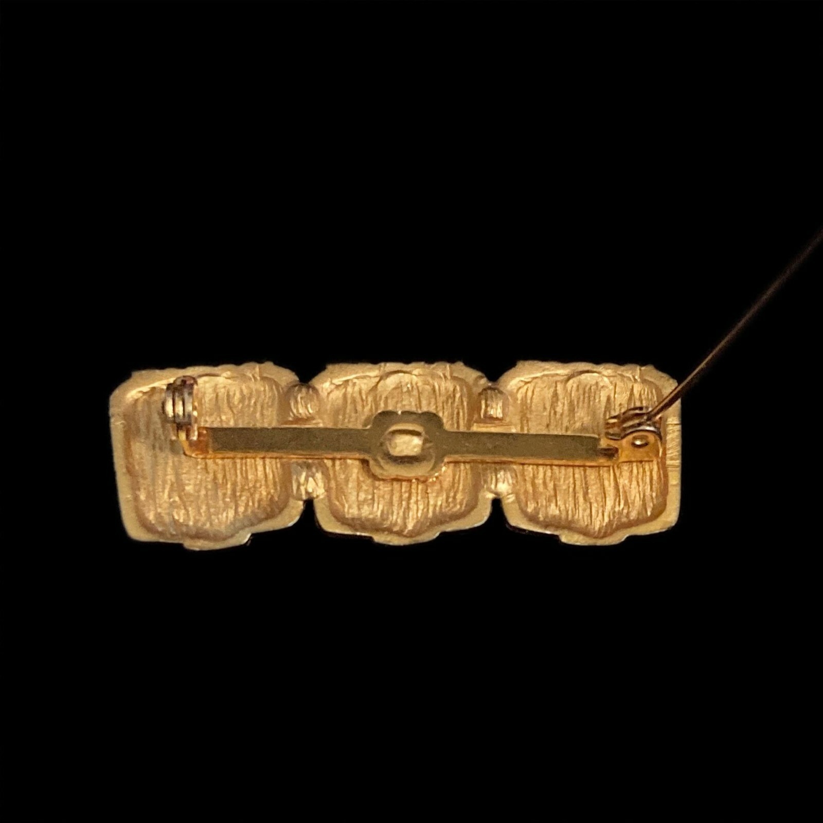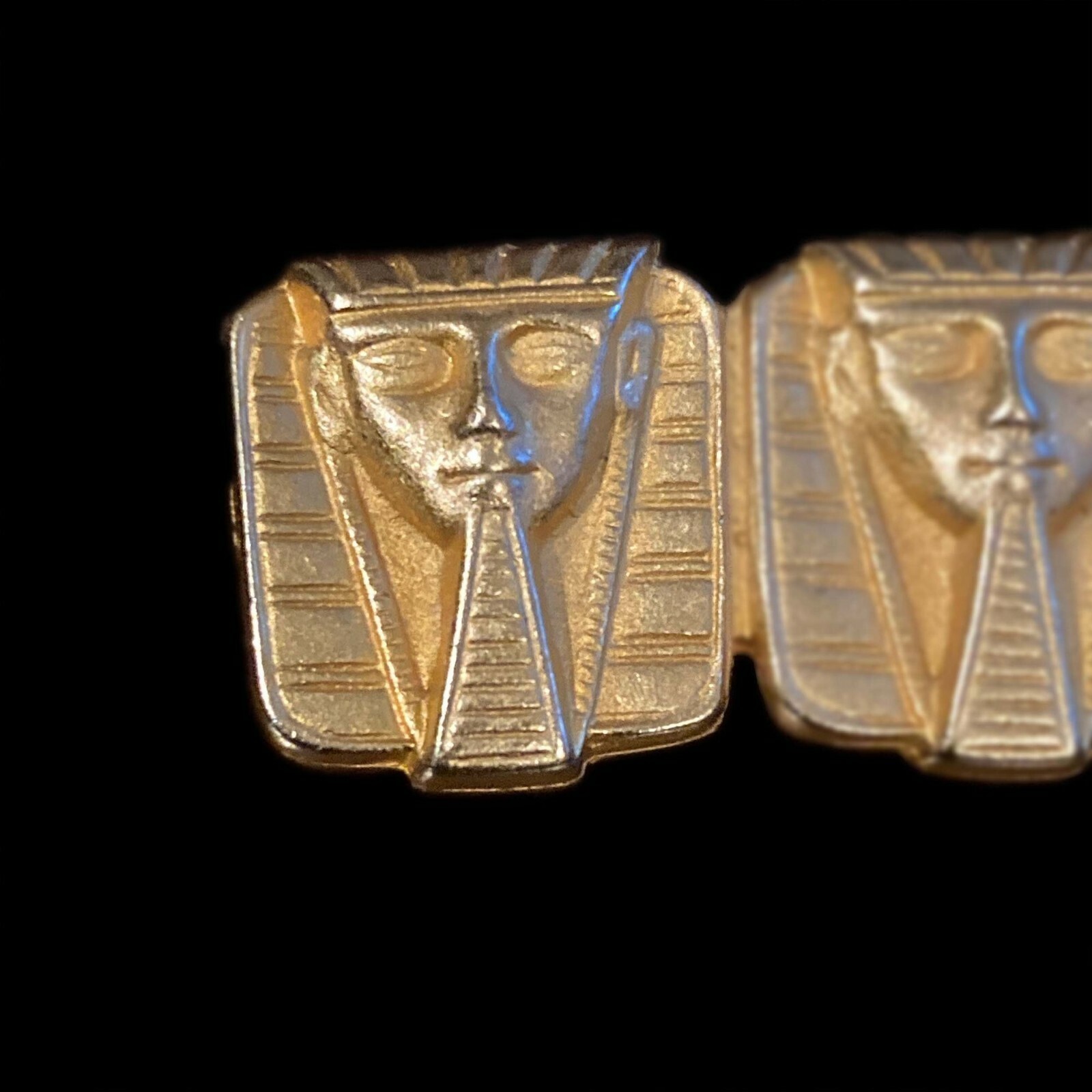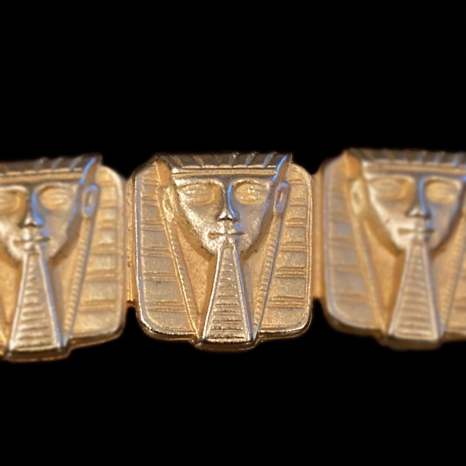 Vintage Egyptian revival pharaoh brooch in gold-tone metal. The brooch is made up of three plaques with the face of a pharaoh on each. The pharaohs are shown with headdresses and postiche or fake beards. The piece measures 1 3/4" (4.45 cm) long. Each pharaoh measures 5/8" (1.59 cm) x 5/8" (1.59 cm). The brooch is secured with a hinged pin and safety clasp. The piece is unmarked.