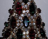 A collector piece! A lovely confection of red and green marquise-cut rhinestones surrounded by clear round-cut rhinestones and accented with round red and green rhinestones. All are prong-set in a beautiful gold-tone setting with a rollover pin bar clasp. Signed. Measures 2-1/2" tall and 1-3/4" at the widest point. In excellent condition