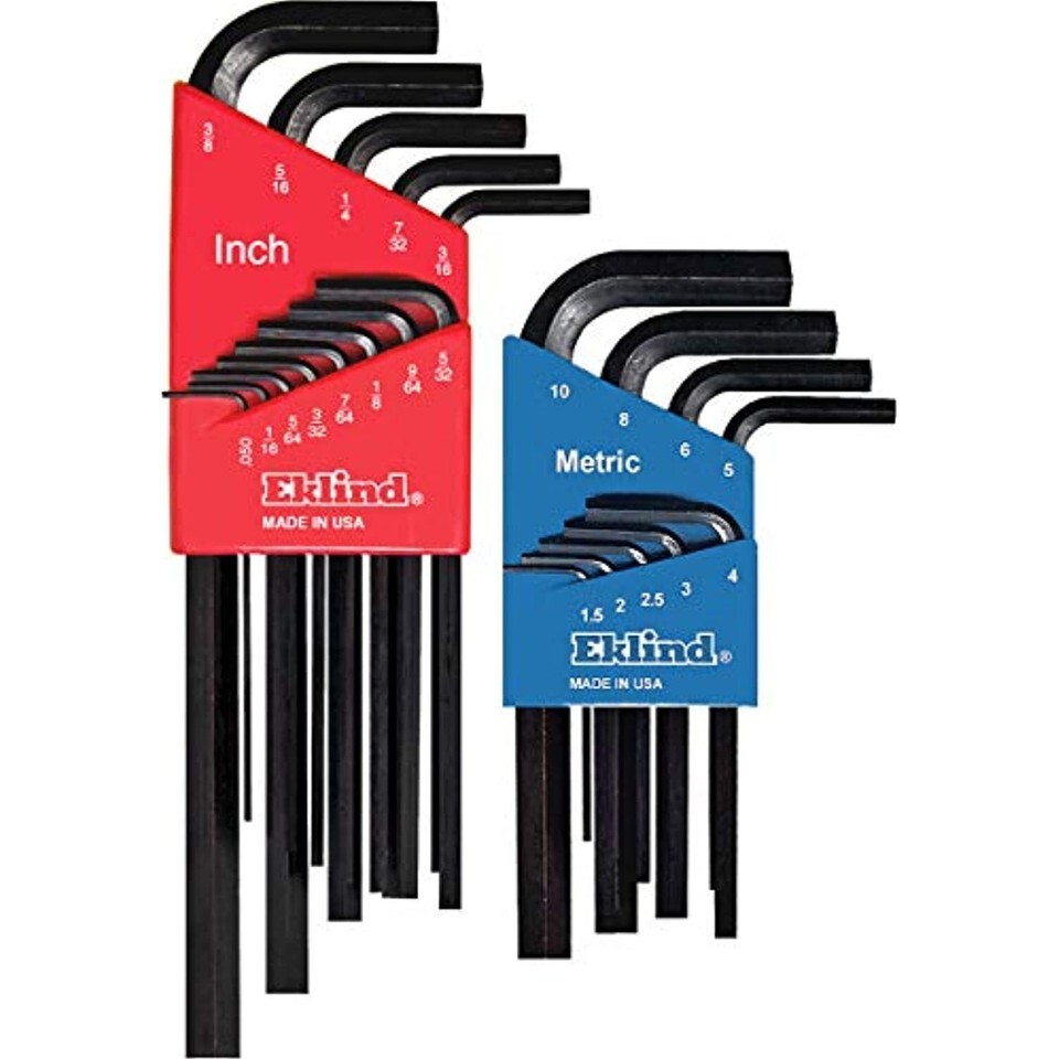 Product Description EKLIND TOOL COMPANY is America's leading manufacturer of high quality, industrial grade hex keys, made with pride in the U.S.A. since 1950. The EKLIND 10022 Hex L-Key allen wrench Combo- Long Inch + Short MM (2 sets 22pc) meets the most stringent requirements of professional mechanics, tradespeople, do-it-yourselfers and hobbyists. From the Manufacturer Four combinations of Hex-L Key Sets are available in popular inch and metric sizes. These sets are conveniently organized into separate molded plastic holders that are color-coded, red for inch and blue for metric.