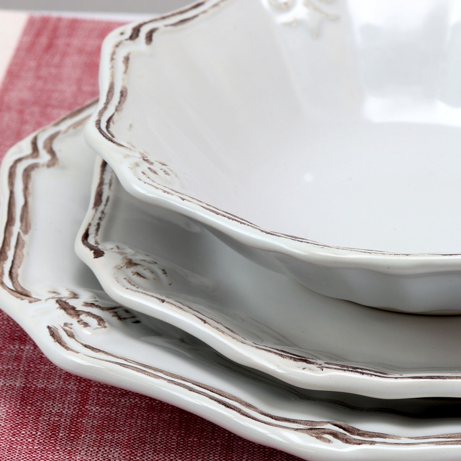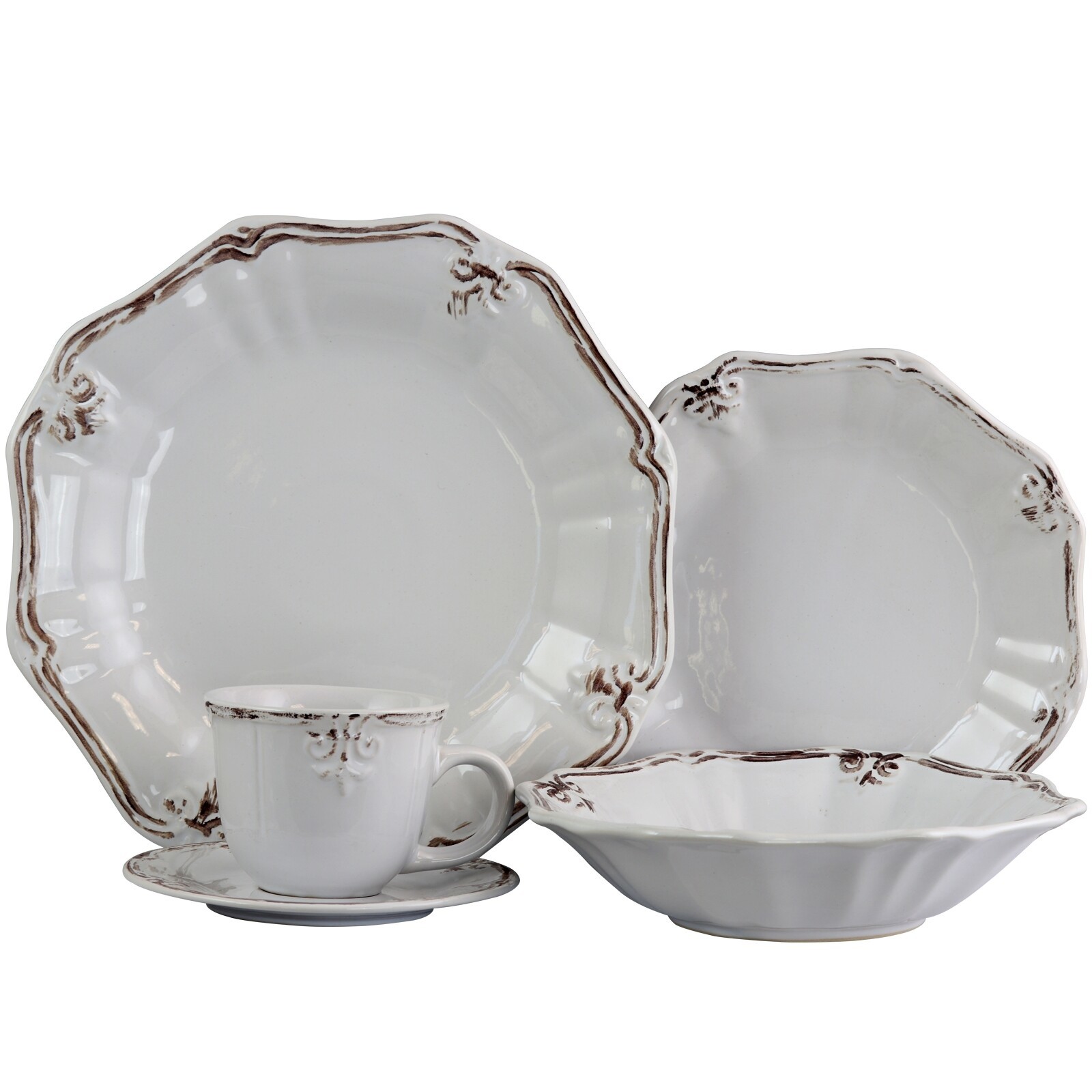 Set your family's table with the unique distressed pattern featured in this 20-Piece Elama Fleur De Lys stoneware Dinnerware Set in White. A dark hand painted brown floral border on the rim provides a graceful contrast to the slender concentric circles on the plates' base.