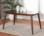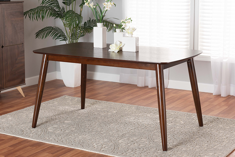 Features: Constructed from rubberwood, MDF wood, and LVL Walnut brown finish Rectangular tabletop Seats up to six (6) Angled legs Textured wood grain Set Includes: One (1) Dining Table
