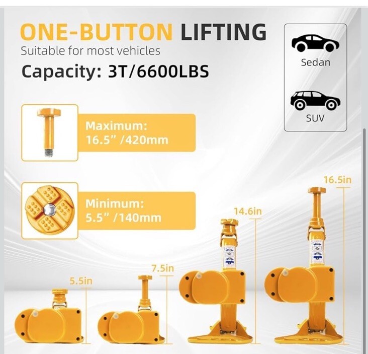 The FEANISIFEI Electric Car Jack Kit is a powerful and convenient tool for lifting vehicles with a 3 ton capacity. This automatic scissor lift jack operates on a 12v power supply, making it compatible with most automobiles. The portable floor jack features a compact design in a vibrant yellow color, making it easy to locate and transport. With this product, users can safely and efficiently lift vehicles for maintenance or emergencies.