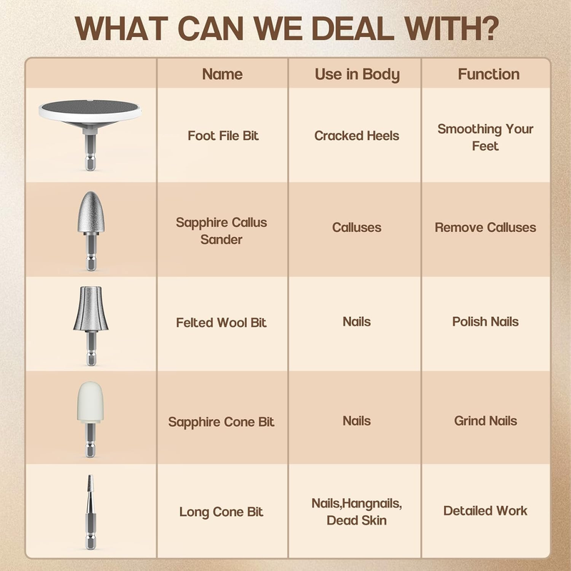 Packing List: The exquisite packaging box includs the electric nail file, 5 high-quality attachments, 30pcs Coarse Sandpaper, USB charging cable, dust cover and instructions. Such an efficient, safe pedicure sets for feet is the thoughtful gifts for women, man, mum on Mothers Day, Christmas, Valentines Gifts for her. ideal Electric Foot Callus Remover