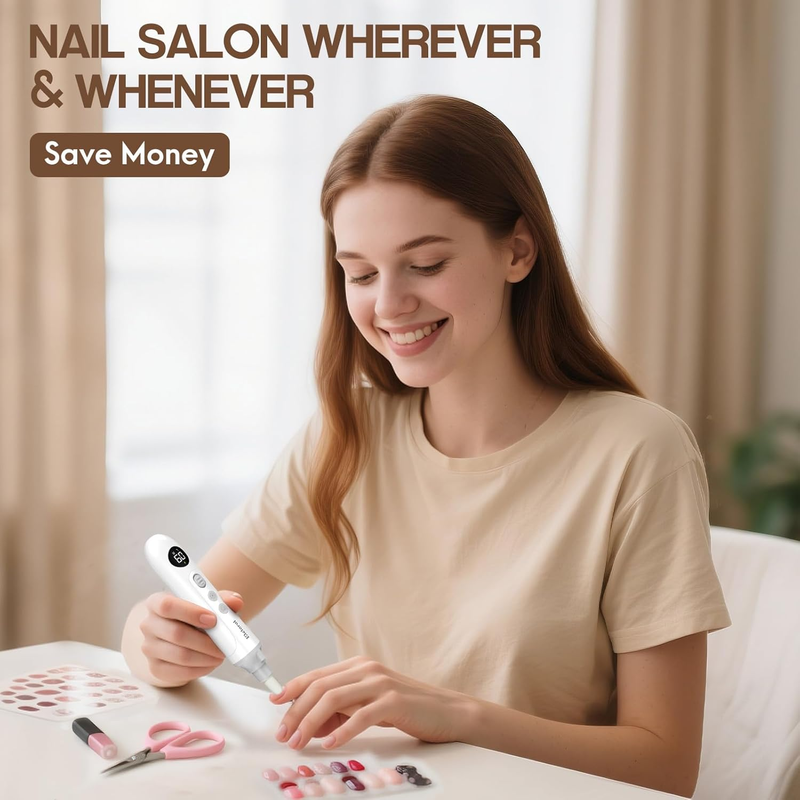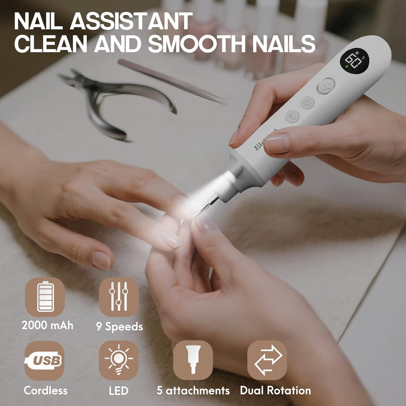 9 Speeds Dual Rotations: This electric nail filer comes with 9 speed modes (1980-4080 U/min 15%) and is designed with forward and reverse rotation directions. Easy to use, even beginners can effortlessly and confidently perform nail care at home