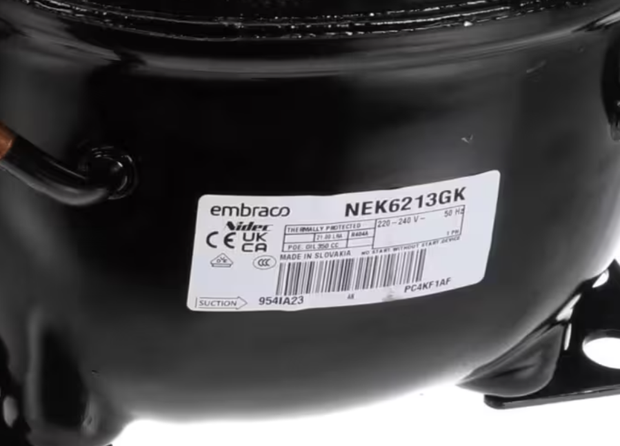 The Electrolux Professional NEK6213GK, 9541A23 Compressor is a high-efficiency refrigeration compressor designed to deliver reliable cooling performance in Electrolux Professional commercial refrigeration systems. Operating on 220?240V, 50Hz, and compatible with R404A refrigerant, this OEM compressor ensures steady temperature control, energy efficiency, and long-term reliability under continuous operation.