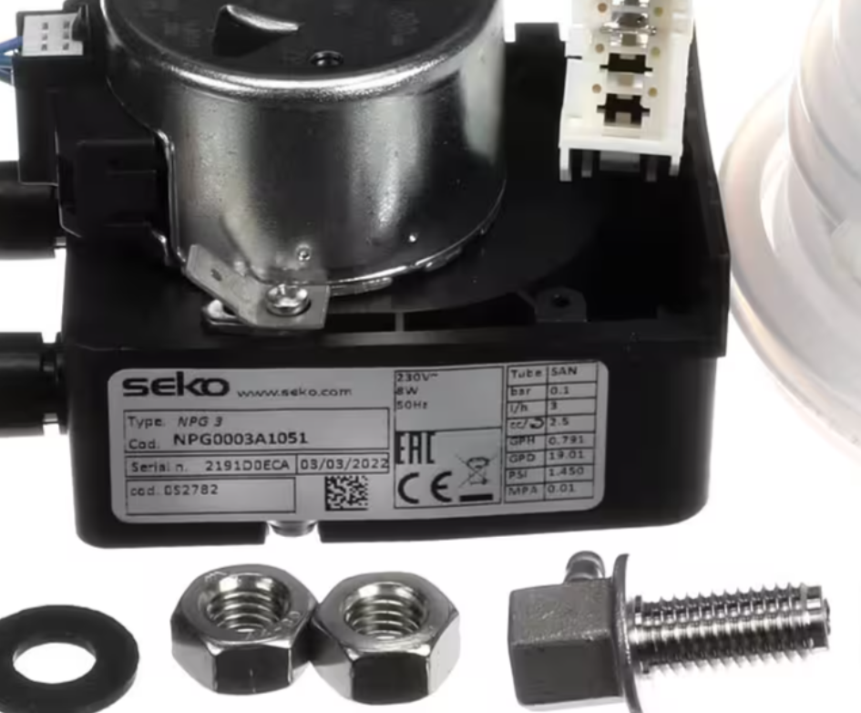 The Electrolux Professional NPG0003A1051 (2191D0ECA) Detergent Pump is a genuine OEM chemical dosing pump engineered to deliver precise amounts of detergent in Electrolux dishwashing and cleaning systems. This durable and efficient pump ensures consistent chemical flow for optimal washing performance, reducing waste and maintaining the correct cleaning concentration during operation.
