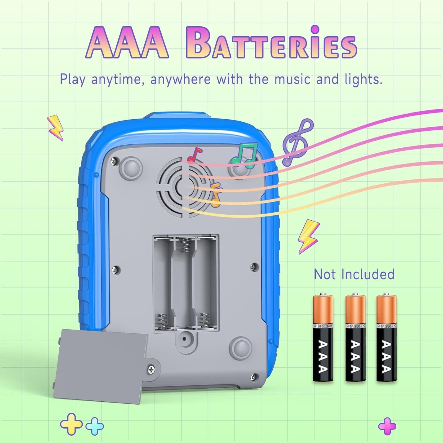 ?Portable Power with AAA Batteries?Powered by 3 AAA batteries (not included), this rhythm game machine lets kids enjoy uninterrupted fun anywhere. Whether waiting for food at a restaurant, riding public transport, or on long trips, this compact console keeps your kids happily entertained, giving you a moment to enjoy your coffee or finish a conversation.