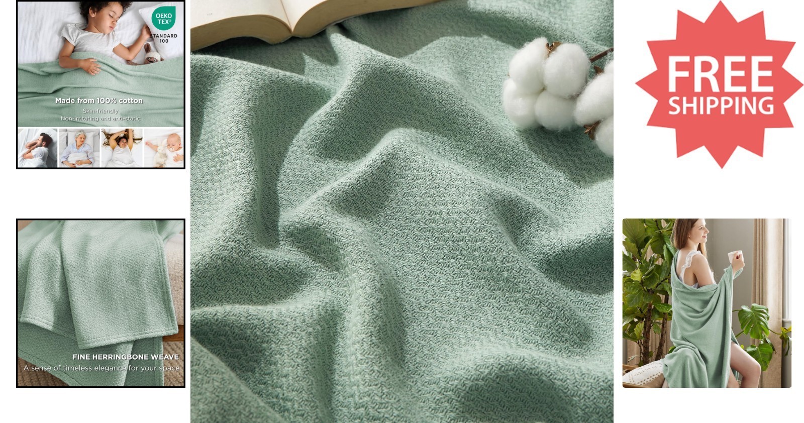 Elegant 100% Cotton Herringbone Throw Blanket 50x70 in Sage Green for All Sea...