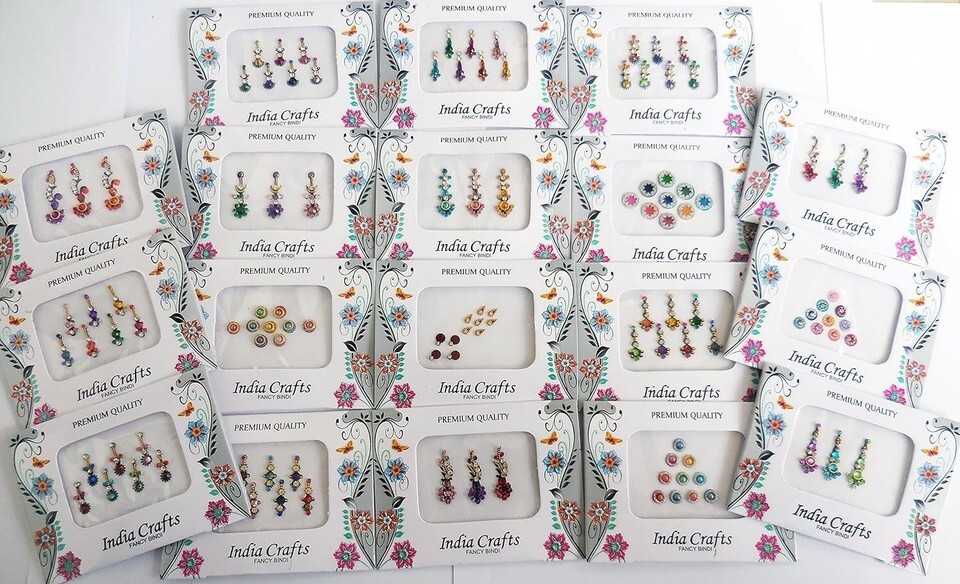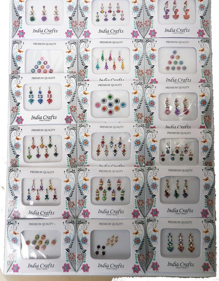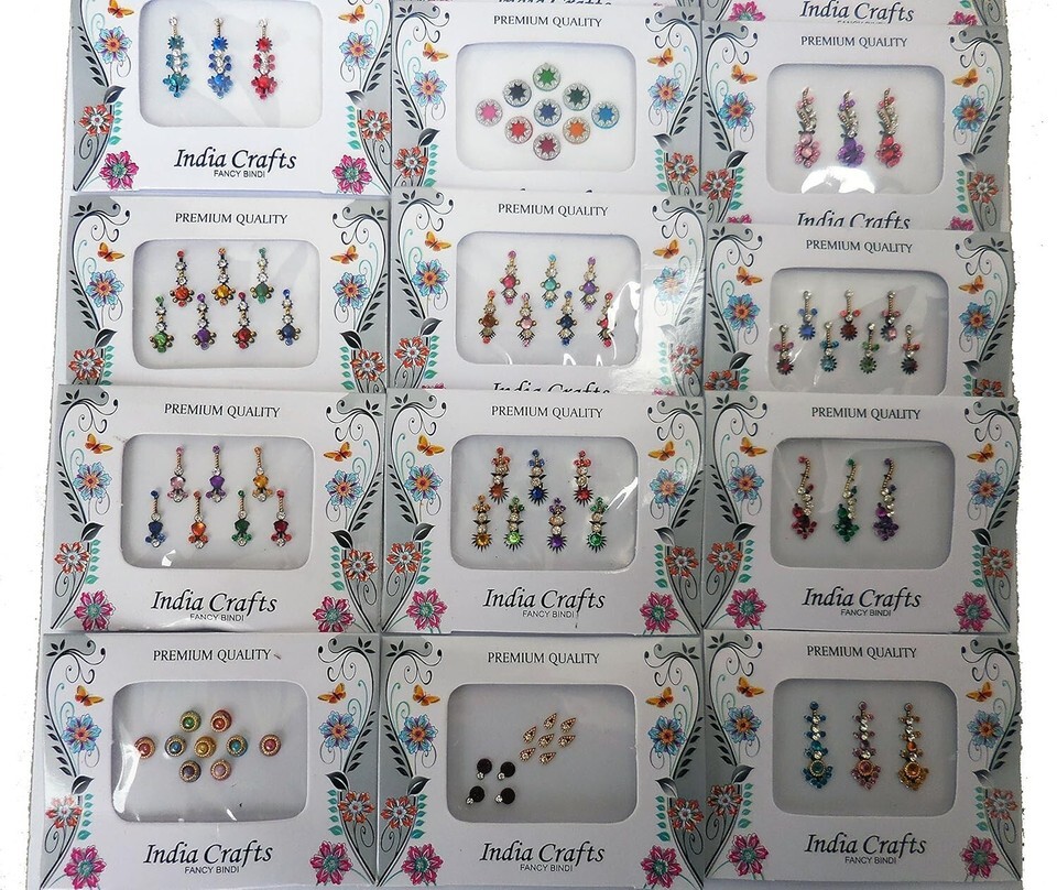12 combo bindi packs featuring multi-designed, multi-colored, and multi-sized options.