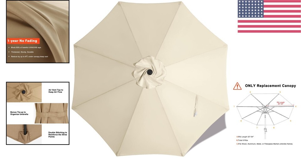 Features: Durable,Waterproof,Non-Fading,95% UV Protection,Reduces Heat up to 6C,Double-Layered Sewing Pocket,Prevents Tearing,Replacement Canopy,Compatible with 8 Ribs,Recommended for Rain,Recommended for Sun,For Patio Use,Adult Target Audience