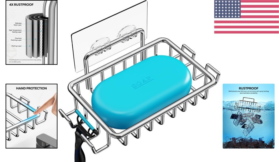 - Elegant Adhesive Soap Dish for Bathroom with 4 Hooks - Silver Stainless Steel