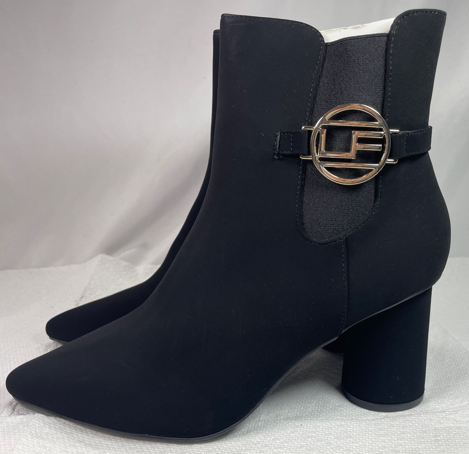 - Elegant Black Ankle Boots 10M with Gold Logo Pointed Toe Suede Spool Heel NEW