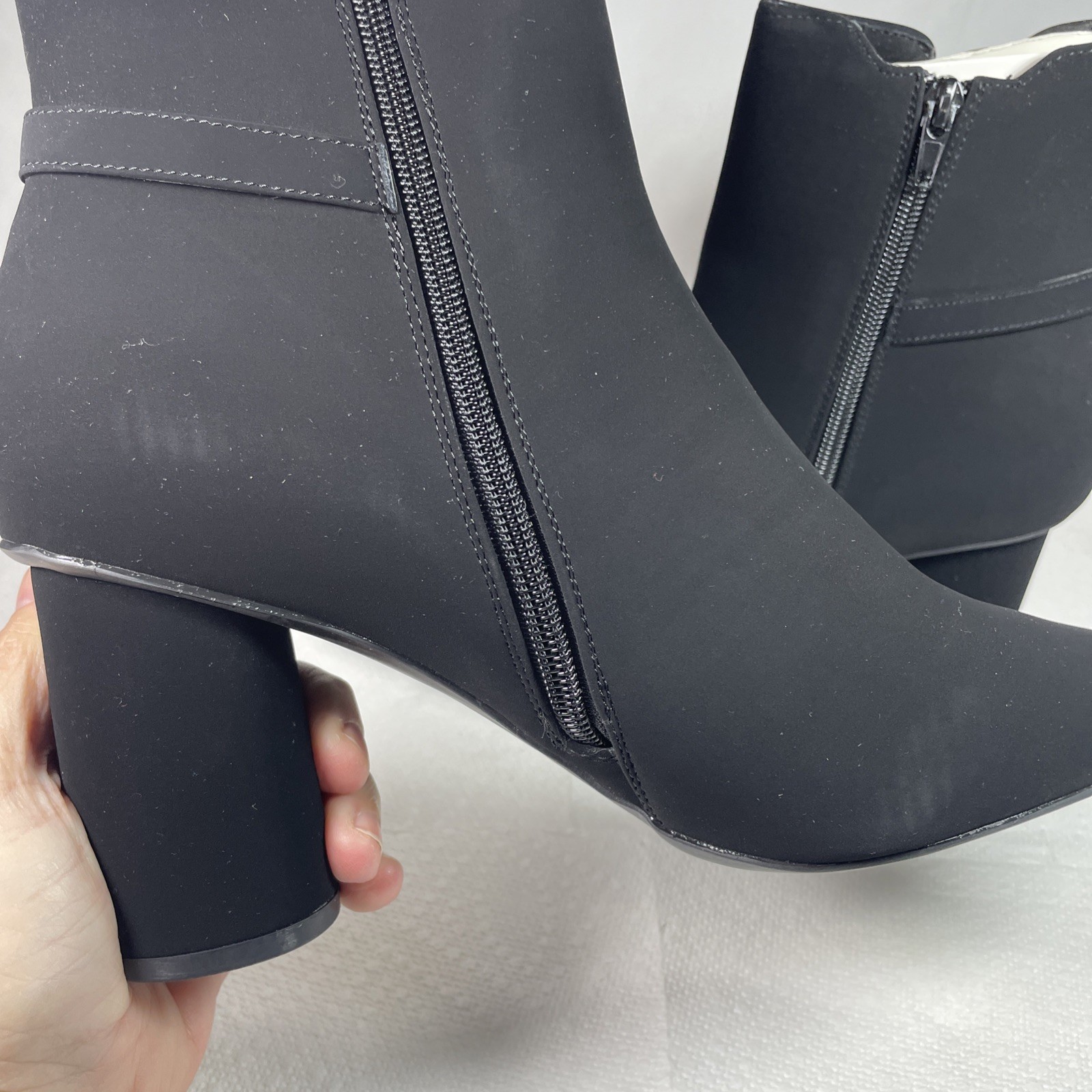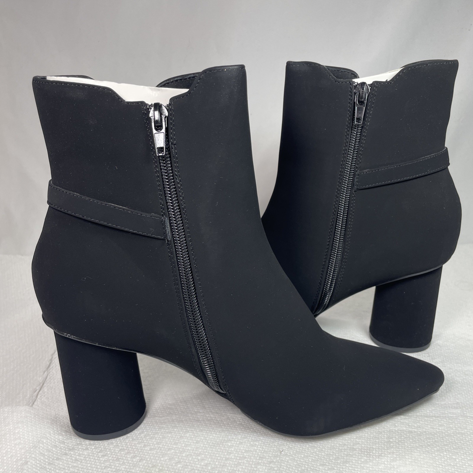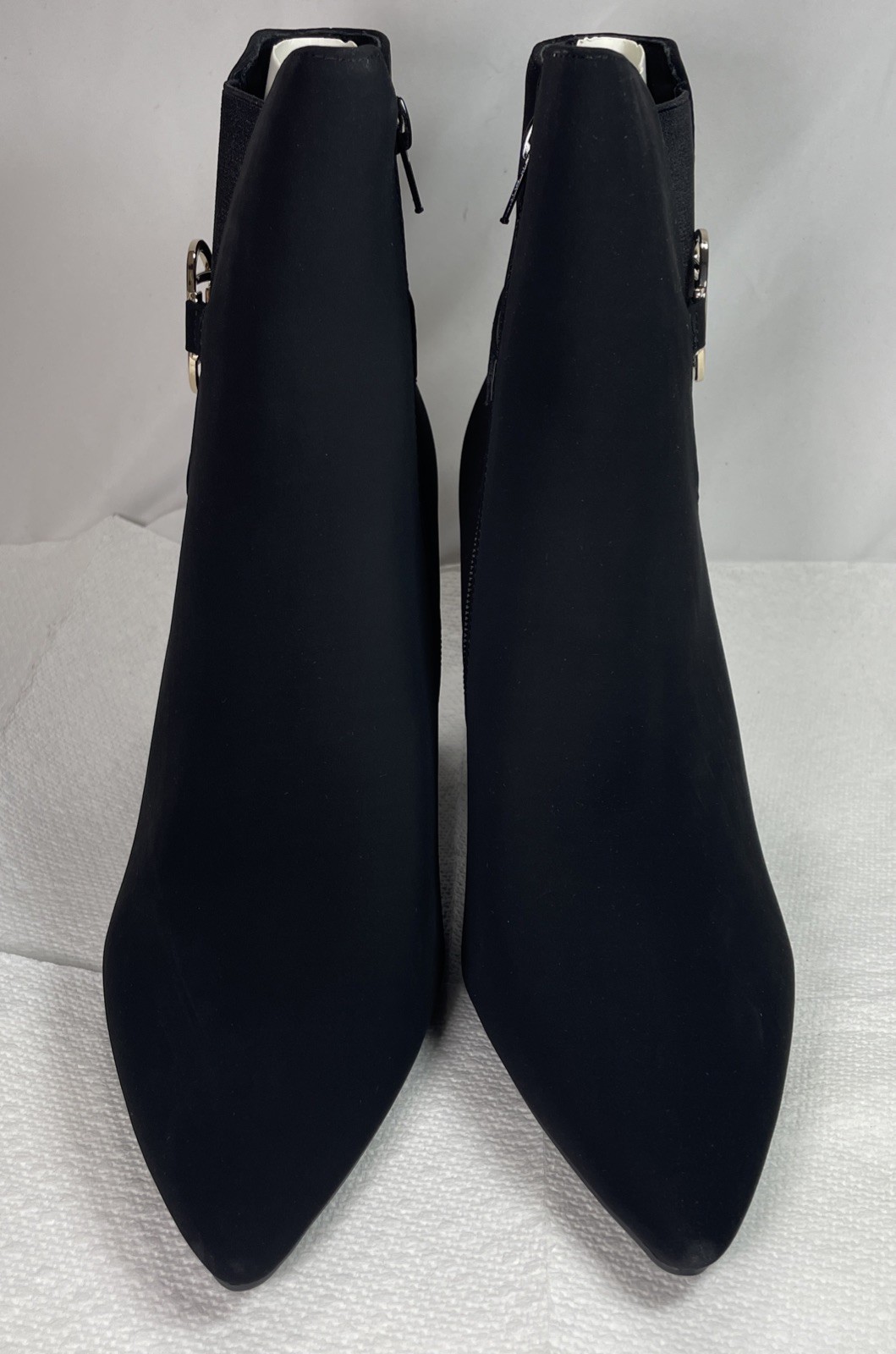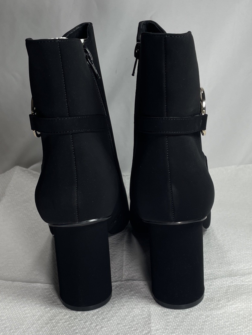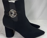 Elegant Black Ankle Boots 10M with Gold Logo Pointed Toe Suede Spool Heel NEW