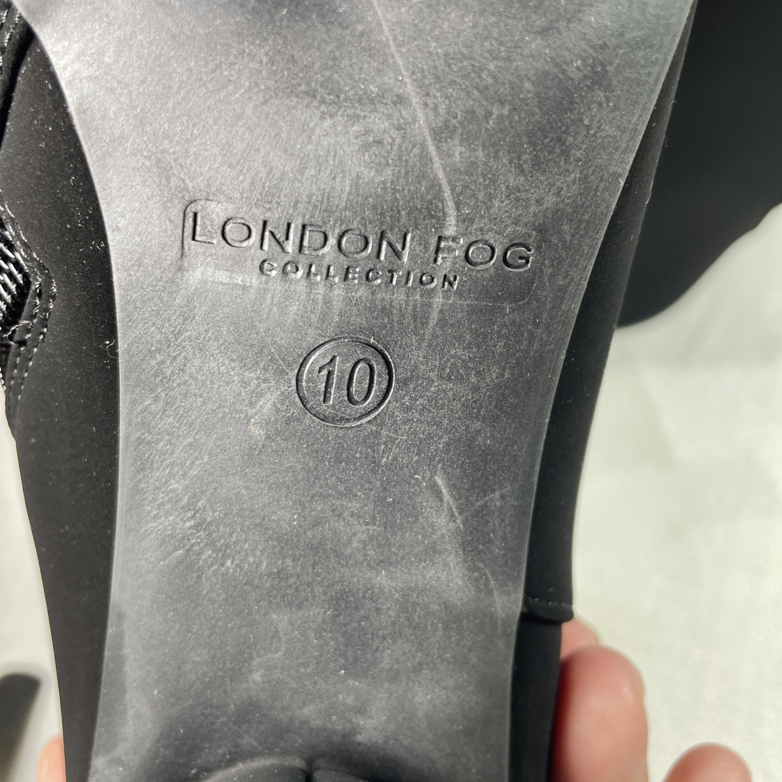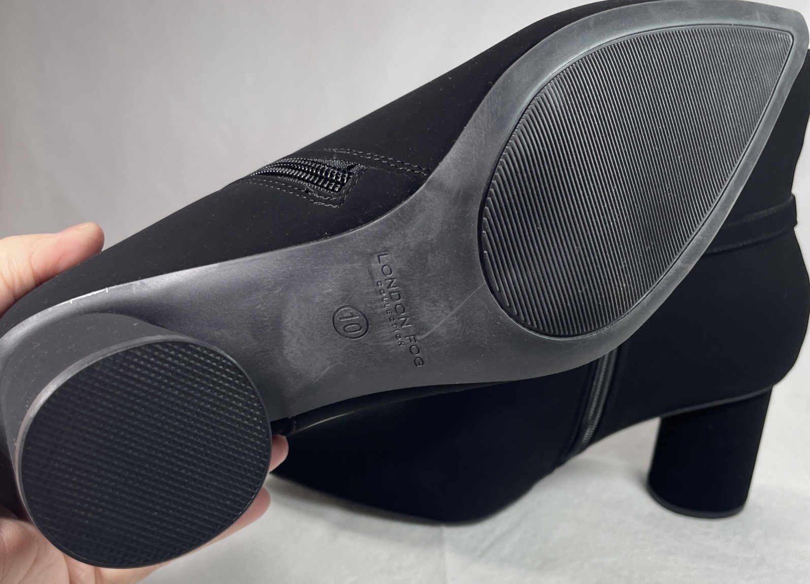 These elegant black suede ankle boots by London Fog feature gold logo detailing on the pointed toe, adding a touch of sophistication to the spool heel design. The spool heel and pump style make them both stylish and comfortable, perfect for completing any outfit with a touch of chic flair. Made with suede material and a zip closure, these boots are a standout addition to any woman's shoe collection, combining classic design with modern accents for a trendy look.