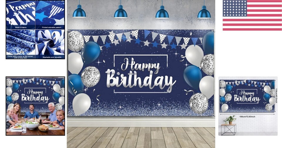 Elevate your celebration with our Elegant Glitter Birthday Backdrop Banner! Measuring a grand 72.8'' x 43.3'', it?s designed to shine at any gathering, thanks to its stunning navy blue and silver theme that captures the joy of your special day. Crafted from quality polyester fabric, it combines durability with elegance, ensuring that your backdrop remains vibrant and intact for years to come.