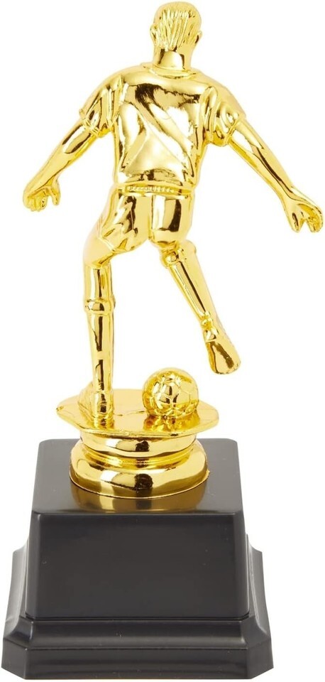 Golden Kicks: These stunning plastic trophies feature an elegant gold-colored finish, topped with a figure skillfully kicking a ball, all set upon a classic black base ? a prestigious display for proud winners.