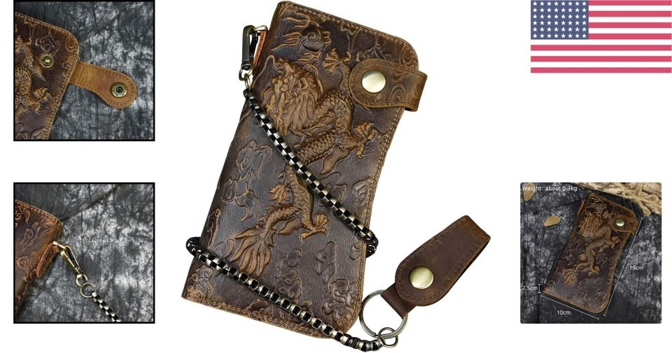 Design: 14 card slots, 1 spacious main cash pocket (compatible with iPhone 6 Plus), 1 inner zipper pocket, 2 narrow cash pockets, and 1 removable chain.