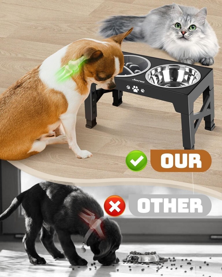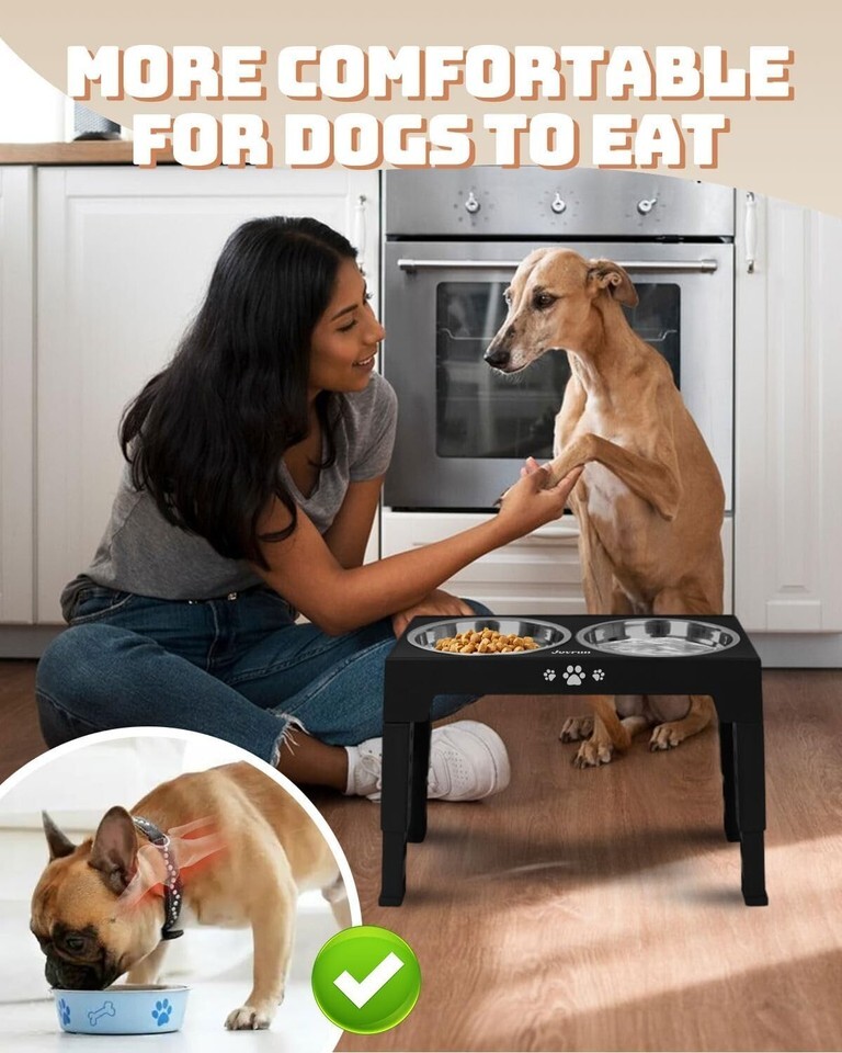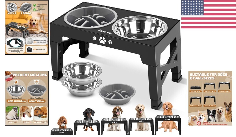 - Elevated Dog Bowls with Adjustable Stand, 2 Stainless Steel Dishes & Slow Feeder