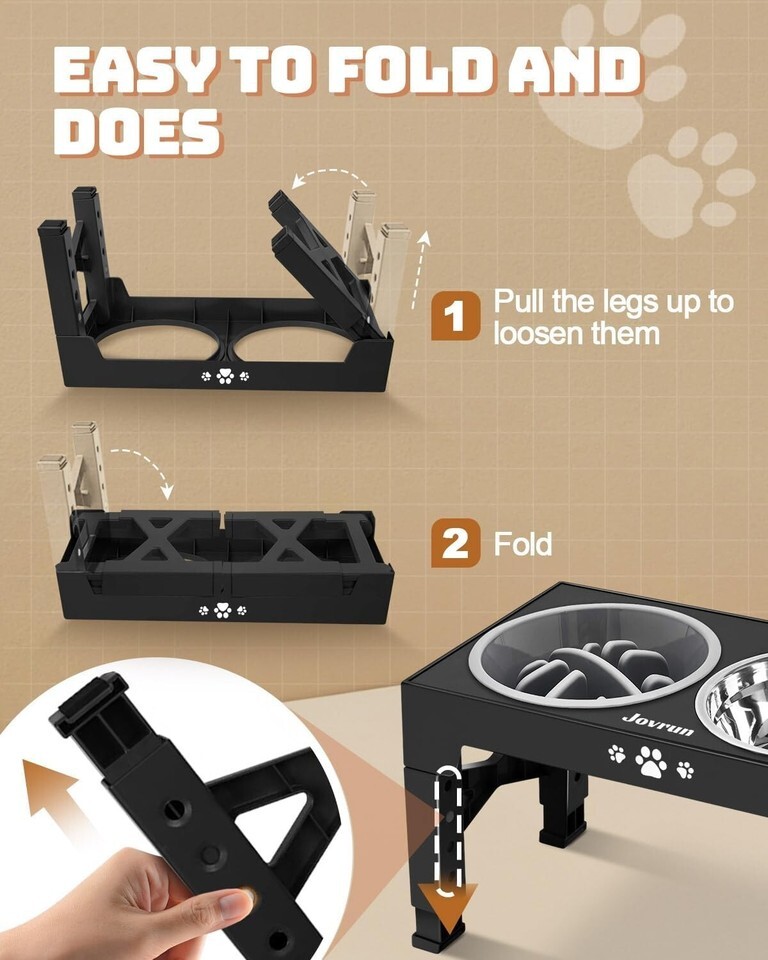 No more sliding bowls! Our anti-slip stand ensures stability and safety while your pet enjoys their meal, protecting your floors in the process. With a noise-free rubber rim, the dining experience becomes serene and enjoyable. Post-mealtime, the legs easily fold away with a simple press, making storage seamless.