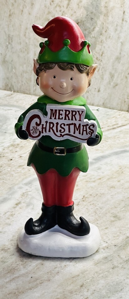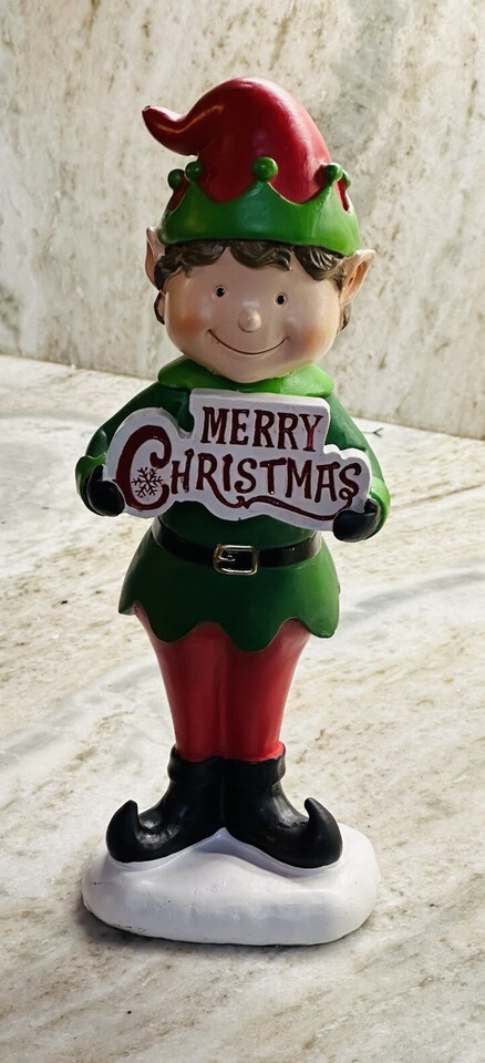 - Elf Statue Holding A Sign That States Merry Christmas- Holiday 12 Inches
