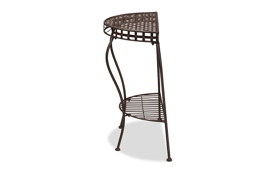 Add the finishing touch to your outdoor oasis with the Elkie outdoor console table. Made in China, this table is constructed from sturdy metal. Its moon-shaped tabletop and shelf serve as an eye-catching pedestal for you to decorate with plants, lawn ornaments, and more. The Elkie requires assembly and is supported by slim cabriole legs for excellent stability. A simple yet impactful addition, the Elkie outdoor console table adds an elegant touch to any patio or deck area.