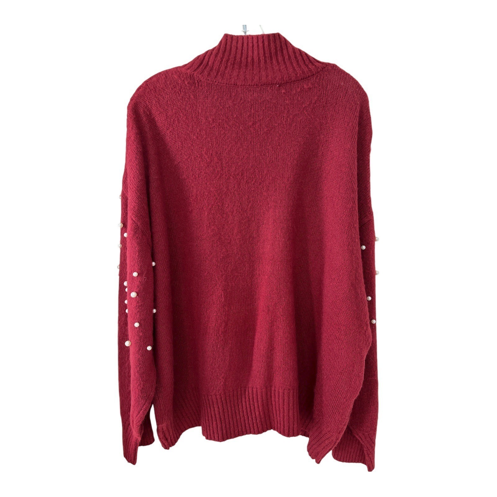 Chic and cozy Eloquii Elements sweater in a rich red knit, featuring allover faux pearl embellishments for a modern yet elegant touch. Designed with a mock neck, long sleeves, and relaxed fit, this piece is perfect for dressing up winter looks while staying comfortable.