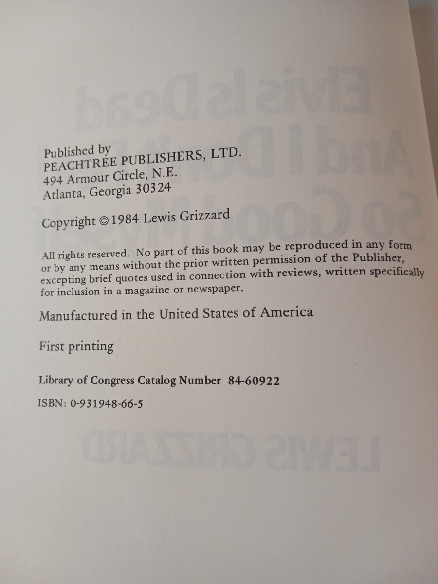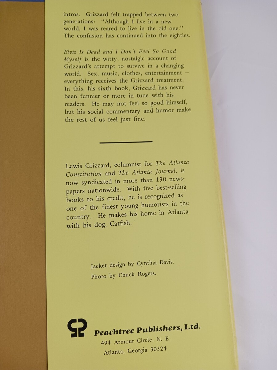 The product is a preowned hardcover book titled "Elvis Is Dead and I Don't Feel So Good Myself" by Lewis Grizzard. Published in 1984 by Peachtree Publishing Company Inc., this first edition nonfiction book falls under the genre of humor and targets an adult audience. With a vintage feel and original English language, the book features a dust jacket and consists of 269 pages. The author's unique narrative explores a variety of topics in a witty and entertaining manner, perfect for fans of Grizzard's work or those interested in a light-hearted take on life.