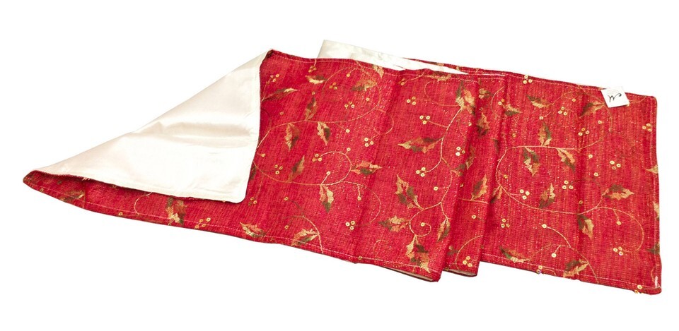Go elegant this Christmas with this beautiful embroidered Christmas Holly Leaves Table Runner with gold sequins. 12x70 inches. Fully hemmed with white backing. Delicate embroidered holly leaves with gold sequin berries. Spot or dry clean only.