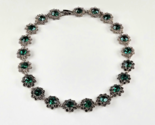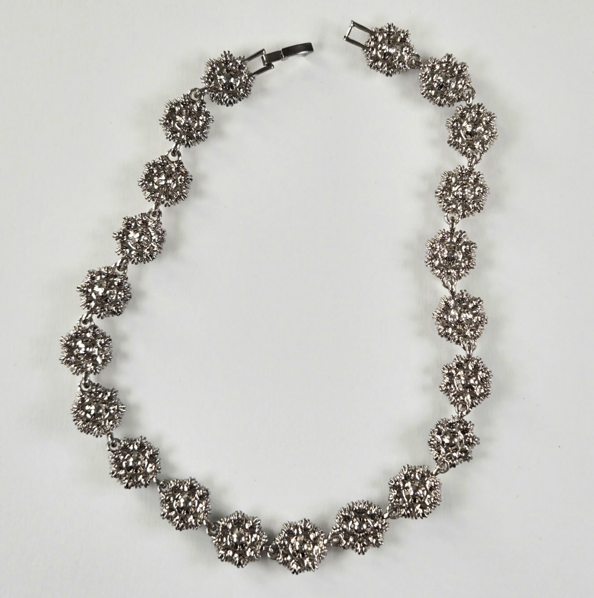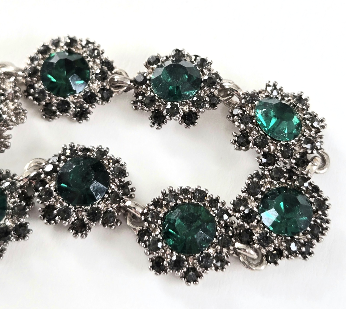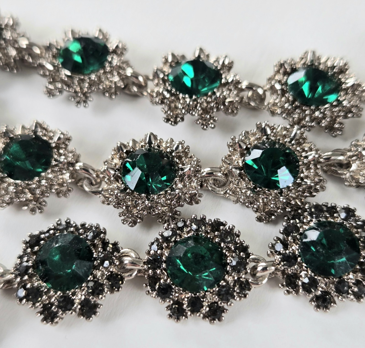 Make a bold statement with this breathtaking vintage emerald green rhinestone choker necklace. Captures the glamour of mid-century costume jewelry with the striking floral cluster link design in gleaming silver tone metal. Whether for prom, a wedding or a formal event this collar necklace delivers maximum impact and sparkle. Perfect as a unique statement jewelry gift, ships nestled in a box ready for a bow.