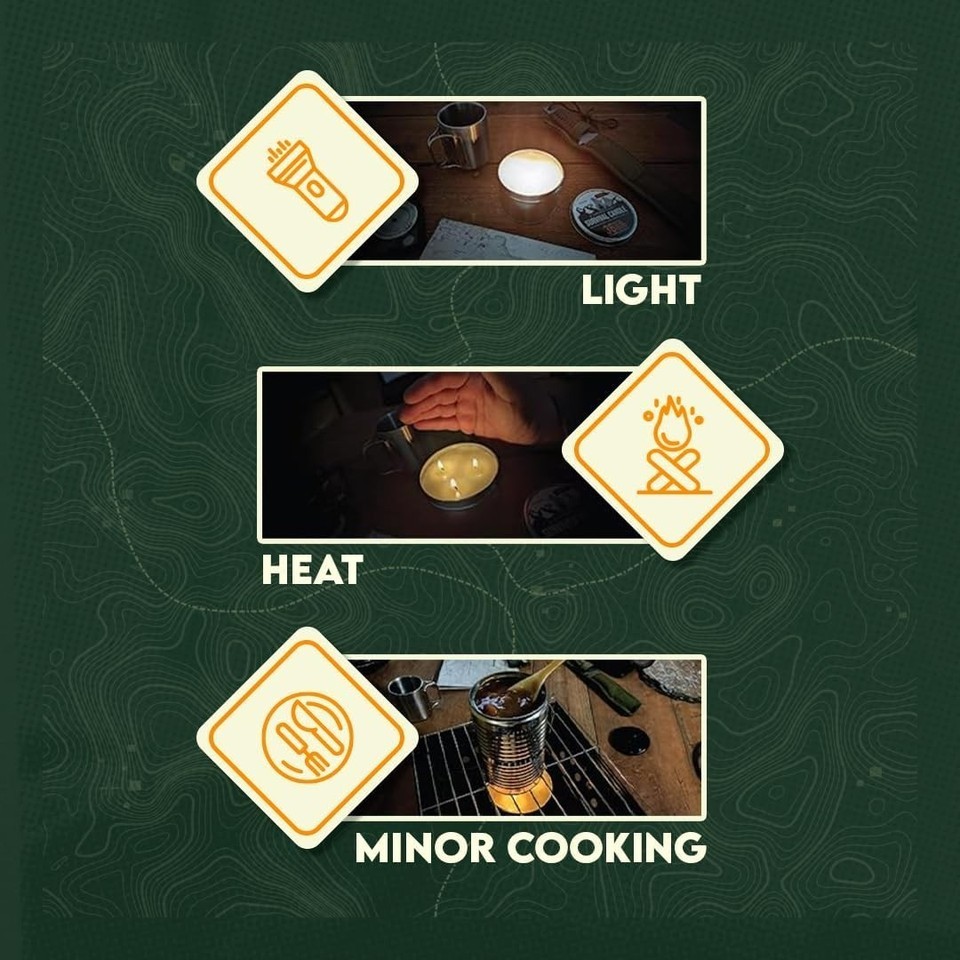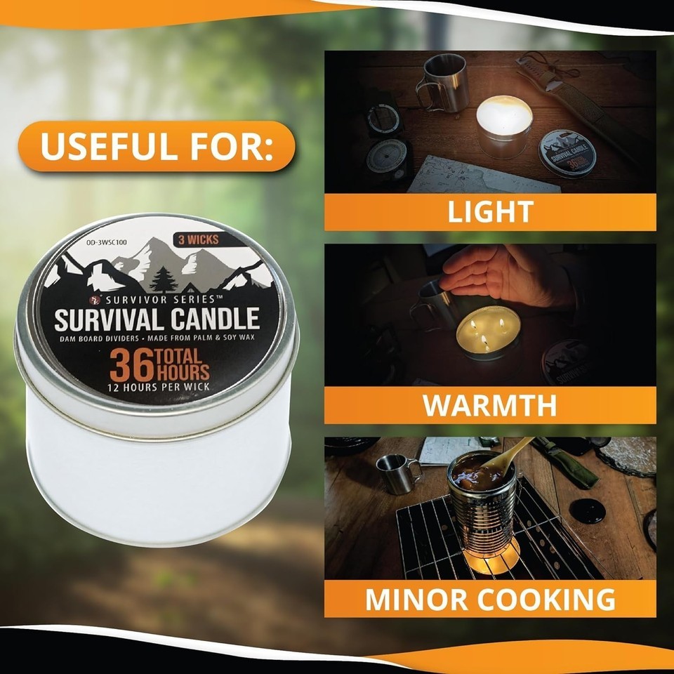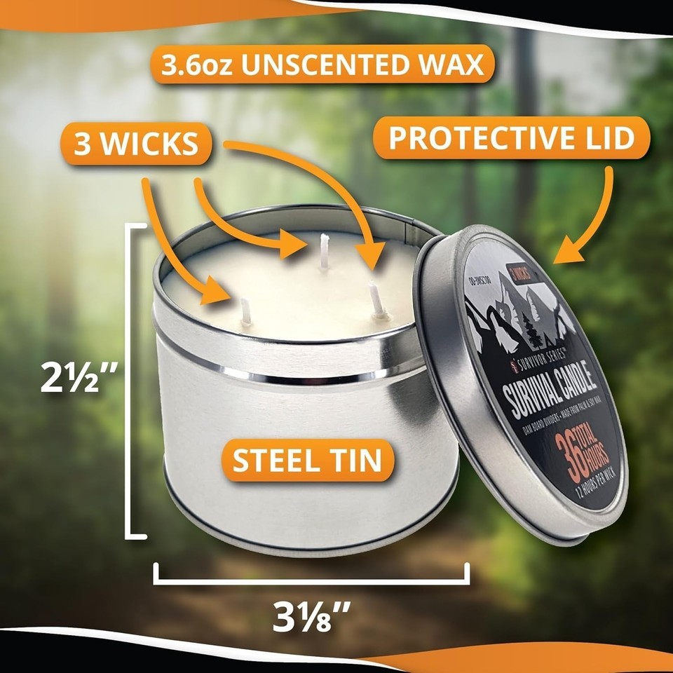 - Emergency Survival Candle 3 Wick 36 Hour Wilderness Outdoor Heat Tin Camping box