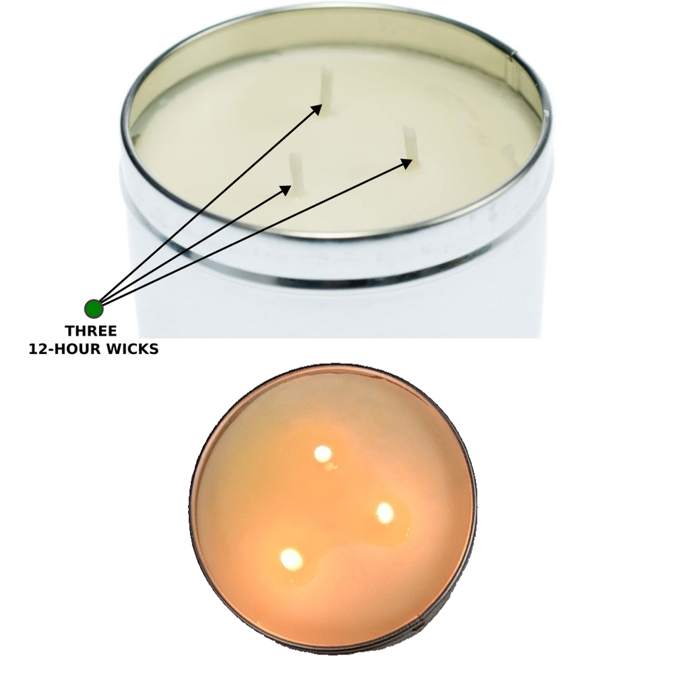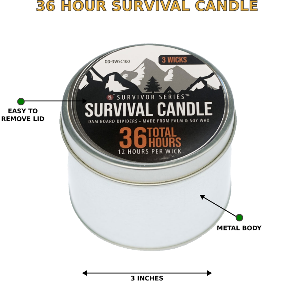The 36 Hour Survival Candle is a candle designed to burn for up to 36 hours. This candle features a three wick design, with each wick lasting for up to 12 hours. With the metal lid attached you can count on this candle to be ready for the next extended power outage or camping adventure.